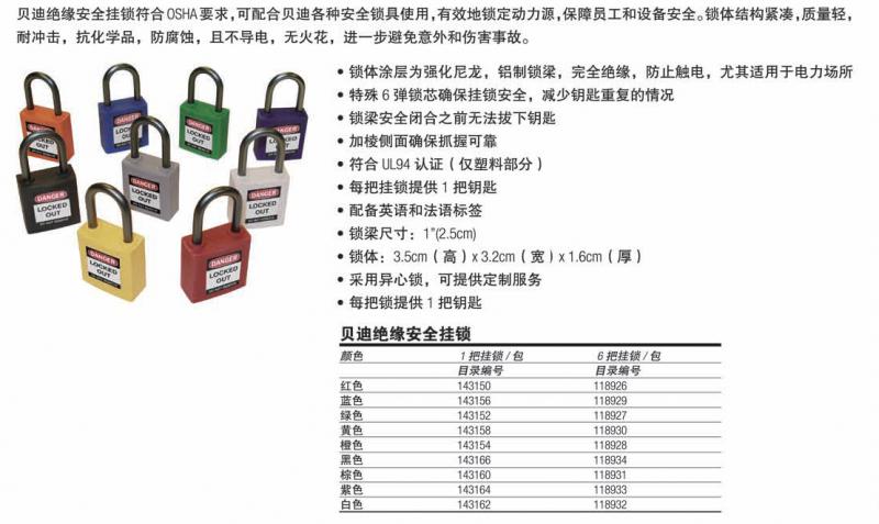 功能最強(qiáng)的上鎖鎖具:貝迪安全掛鎖符合所有OSHA要求,可用于安全替代上鎖過程里使用的金屬鎖具。鎖體絕緣,獨(dú)特的鎖心可防止電流從鎖梁傳至鑰匙,從而進(jìn)一步提高了觸電防護(hù)性能。貝迪安全掛鎖還具有一定的防腐蝕性能。第三方檢測(cè)證明貝迪產(chǎn)品在重復(fù)鹽水噴霧試驗(yàn)條件下的性能卓越。